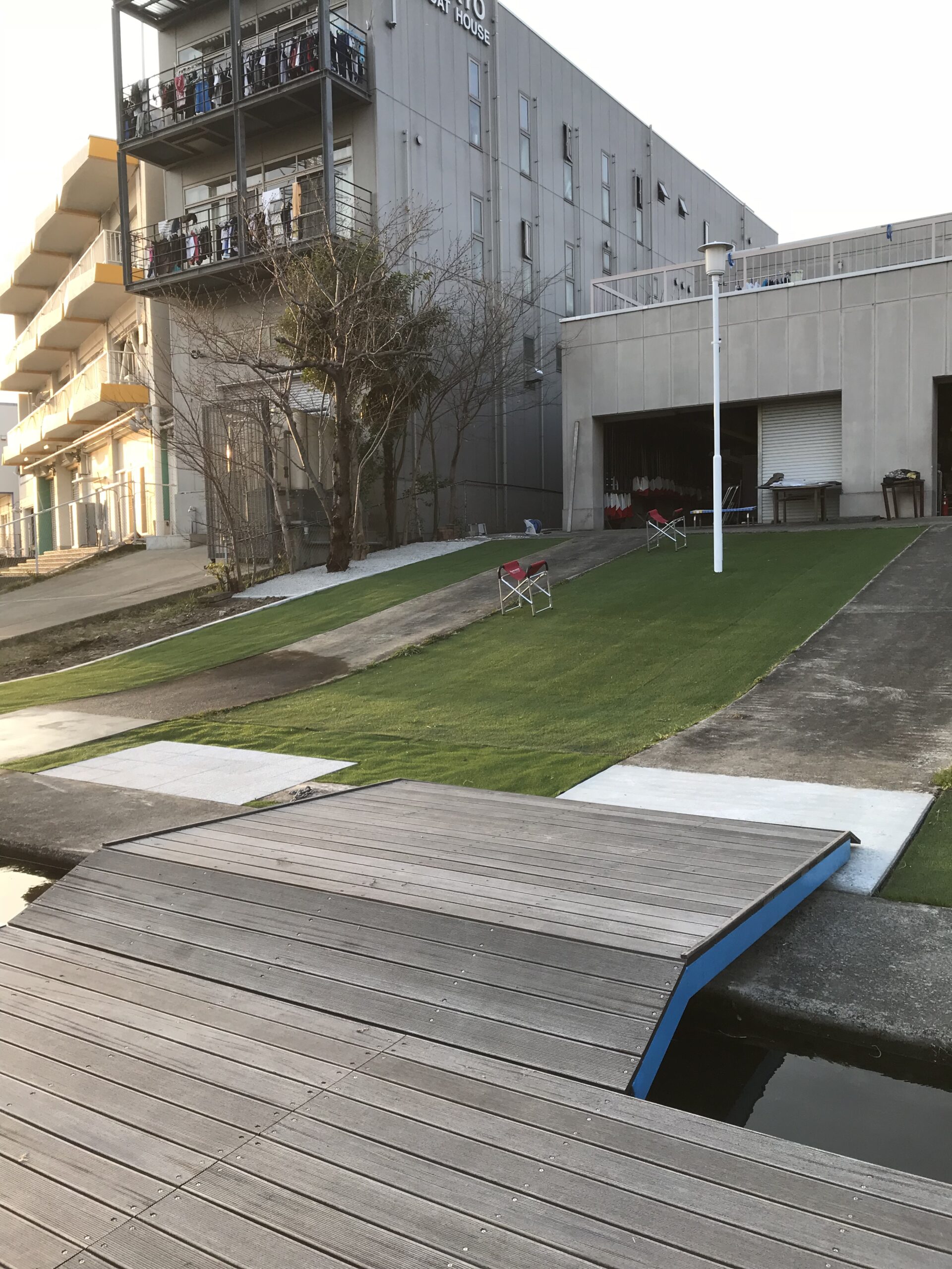 草が生えないように人工芝、砂利敷き、コンクリート打設工を行いました。