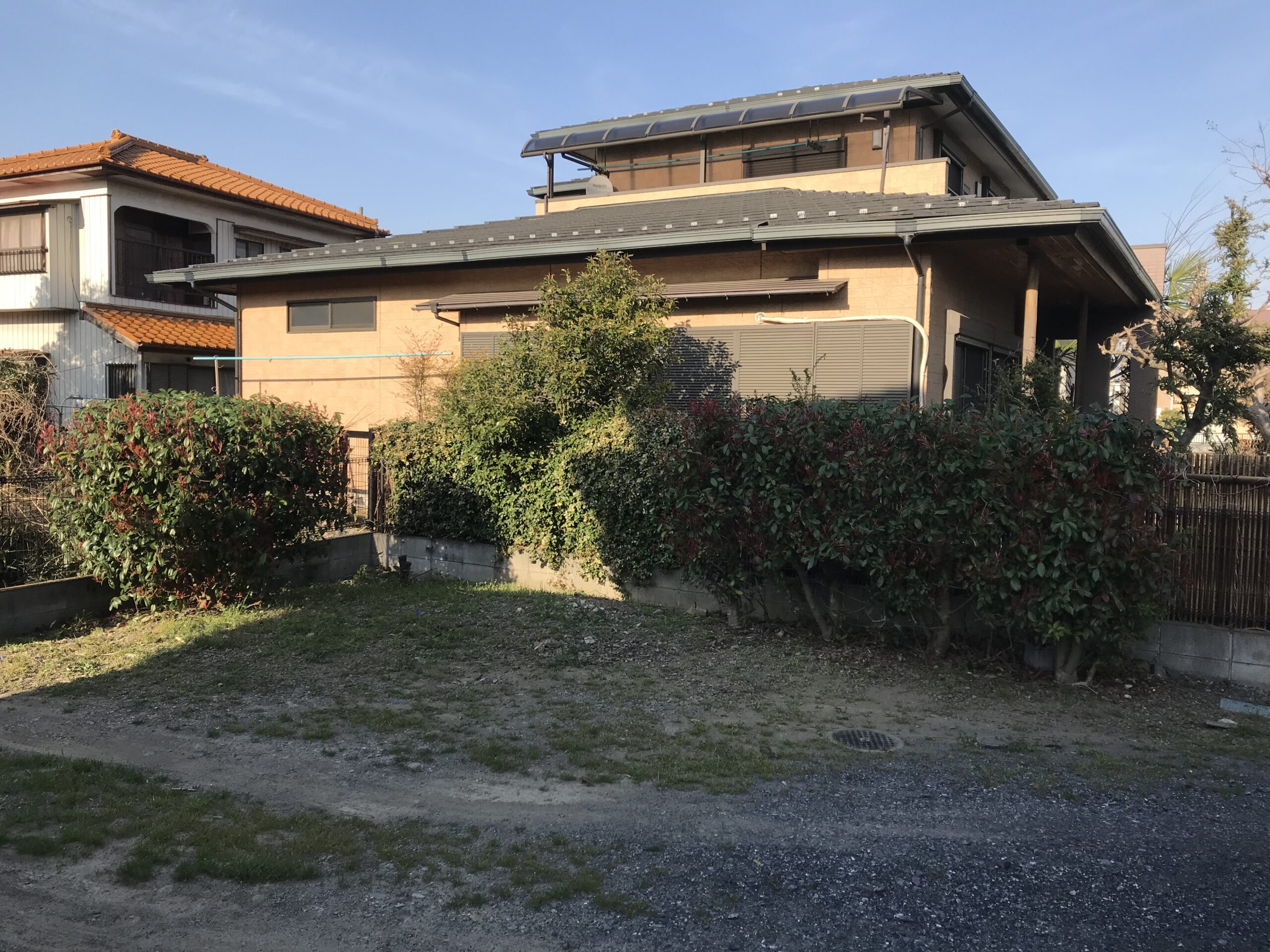 お庭に生い茂った雑草を刈り、整地、敷砂利いたしました。