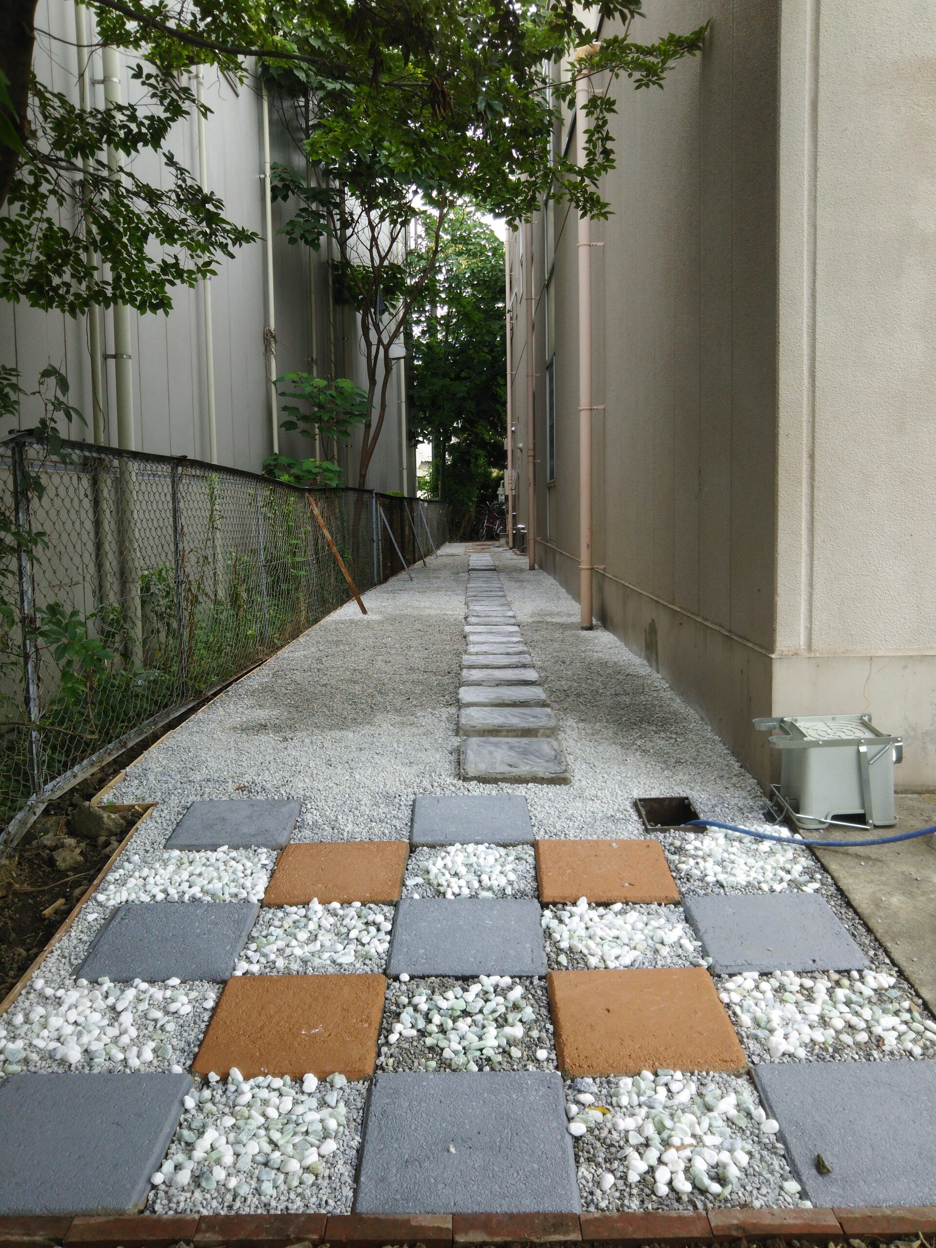 防草シートを張った上に砂利を敷きました。踏み石は色を塗って再利用しました。