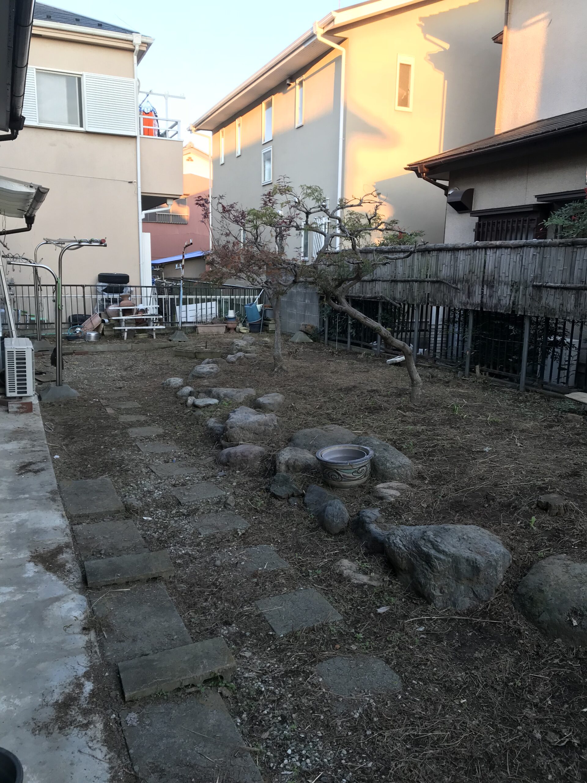 お庭に生い茂った雑草を刈り、整地、敷砂利いたしました。
