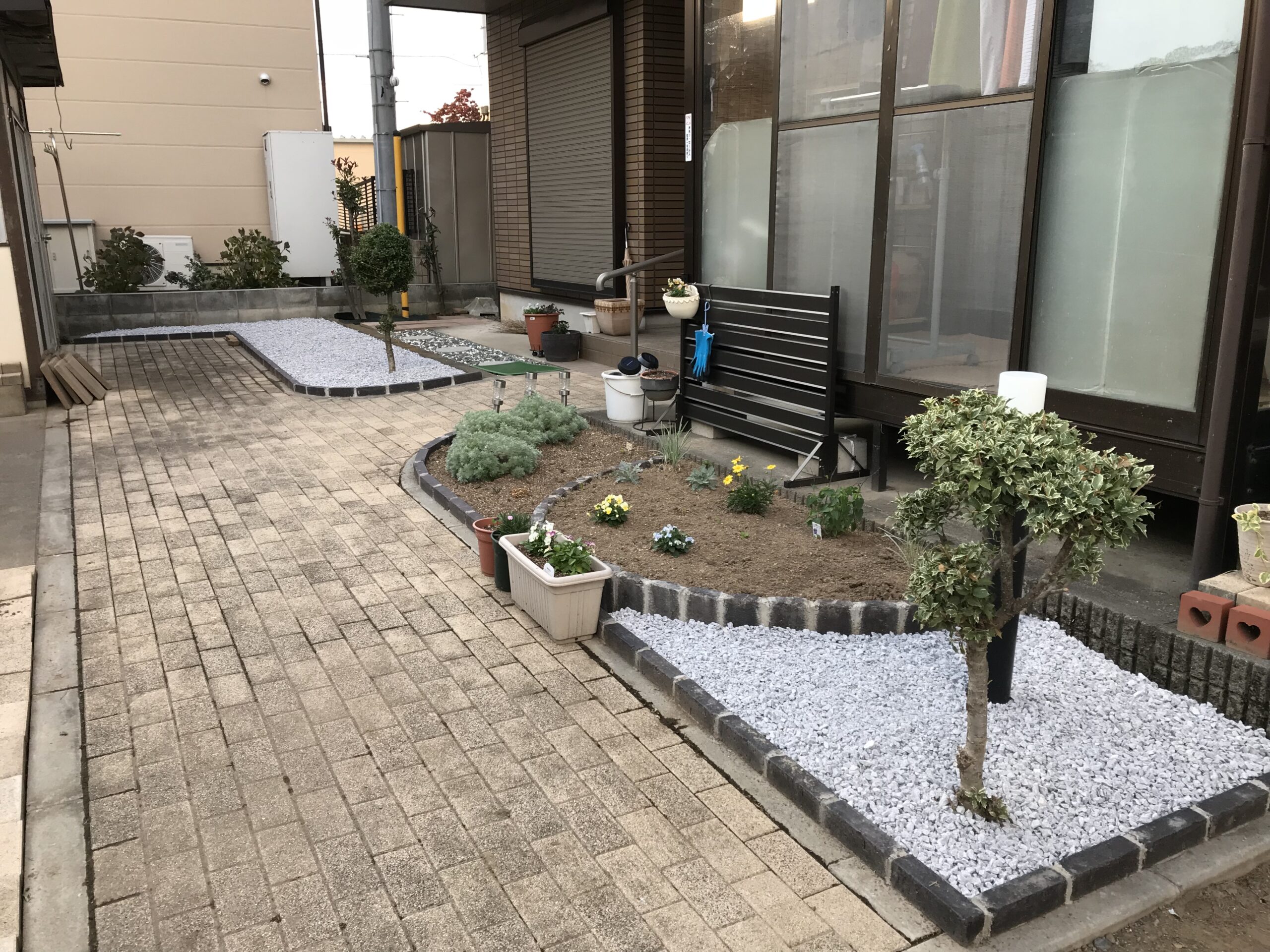 お庭に生い茂った雑草を刈り、整地、敷砂利いたしました。